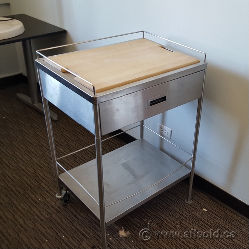 Features wood cutting block, utility drawer, and castors.